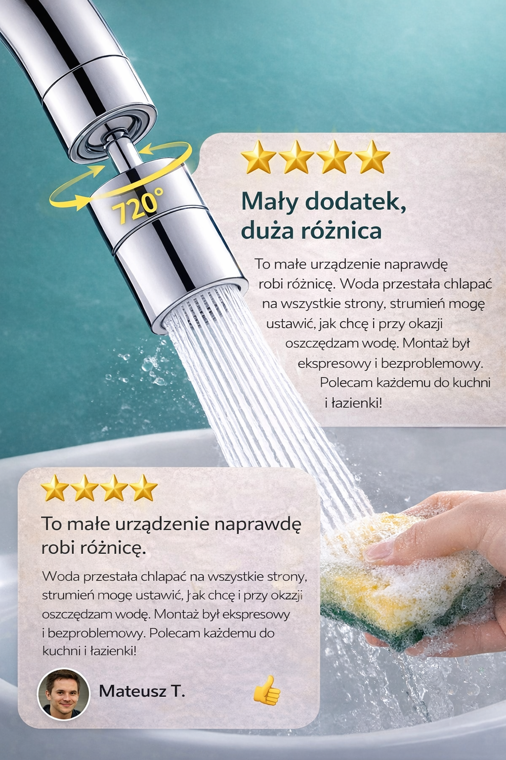 Ten perlator do kranu jest naprawdę bardzo praktyczny. Woda nie chlapie, a dzięki obrotowi 720° mogę łatwo skierować strumień tam, gdzie chcę. Montaż był bardzo prosty i szybki. Do tego zauważyłem, że zużywam mniej wody. Świetny dodatek do kuchni i łazienki!