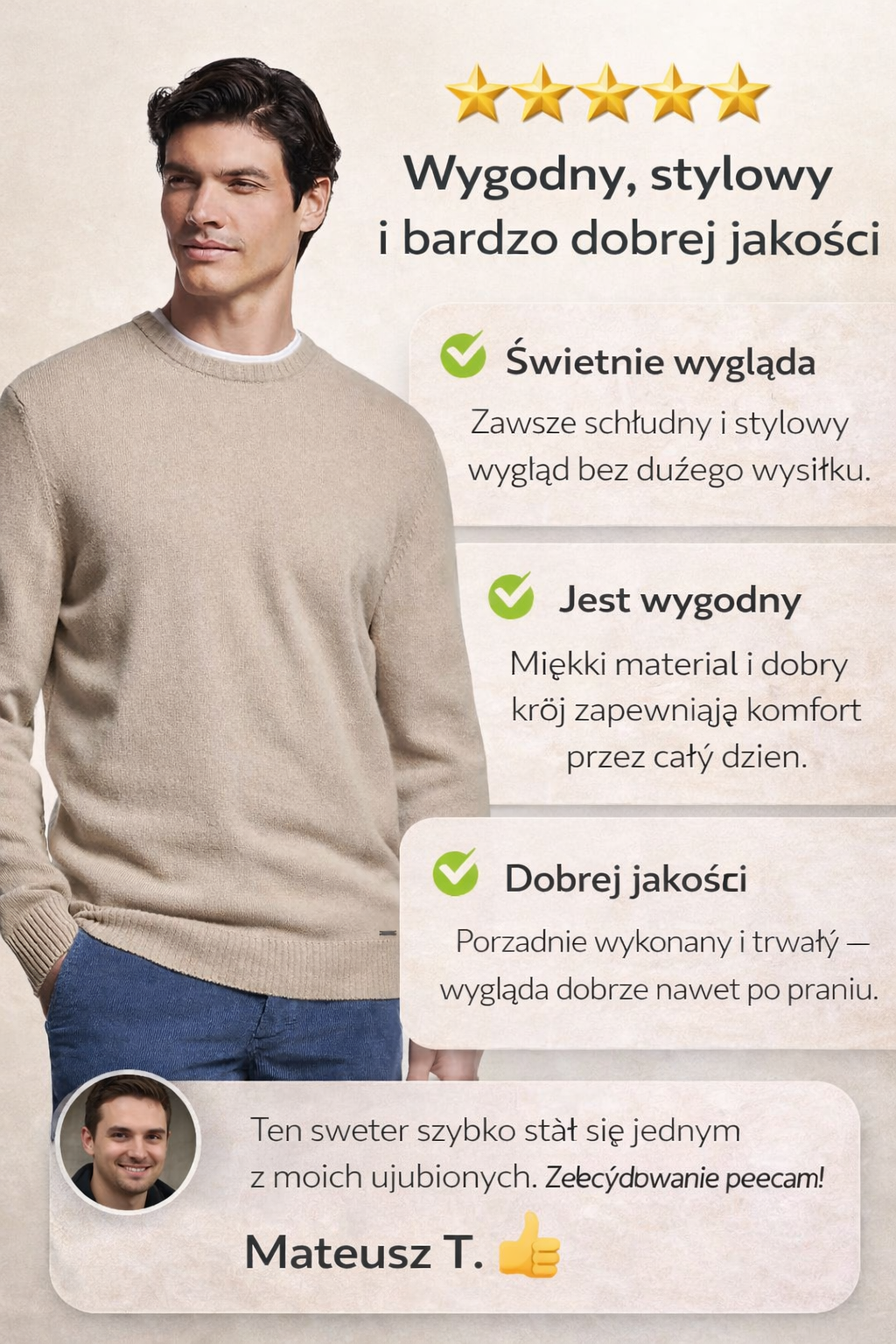 Ten sweter szybko stał się jednym z moich ulubionych. Jest wygodny, miękki i dobrze się układa. Po praniu nadal wygląda świetnie. Noszę go zarówno do pracy, jak i na co dzień. Widać, że to solidny i dobrze wykonany produkt. Zdecydowanie polecam!